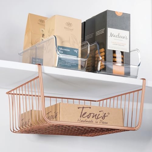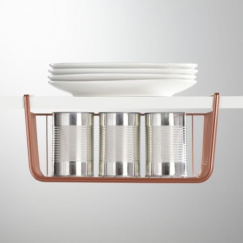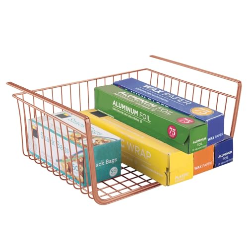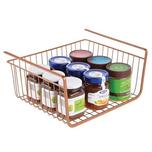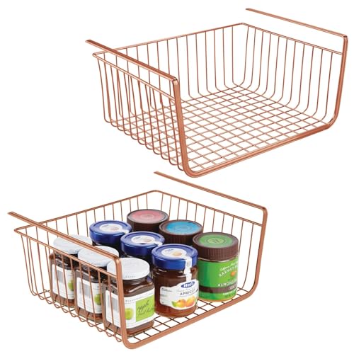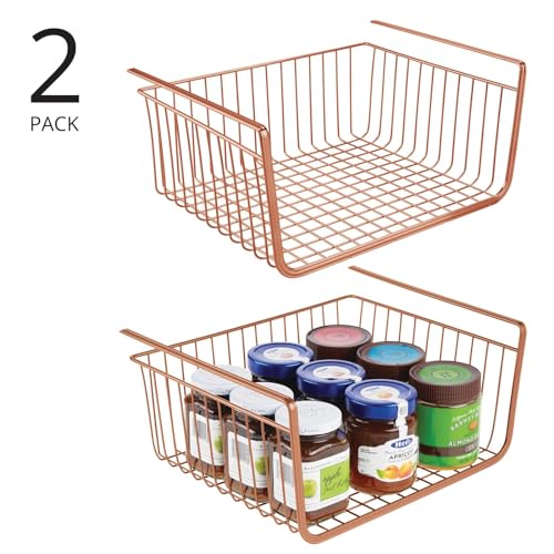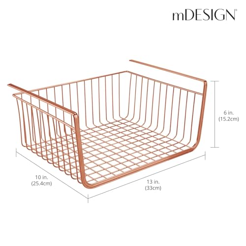 mDesign - سلة معدنية تحت الرف لتخزين المطبخ، سلة سلكية منزلقة لبيت المزرعة، منظم كبير مفتوح من الأمام للطعام والمشروبات والوجبات الخفيفة من مجموعة هايد من ام ديزاين، عبوتان، نحاسي