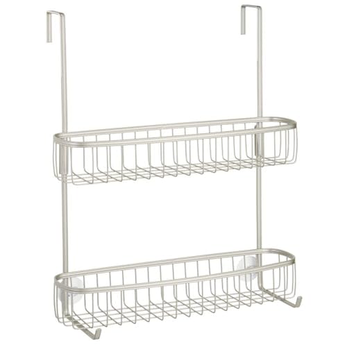 mDesign - حامل دش معلق برفوف وخطافات وقواعد لاصقة للتثبيت، رفوف تخزين تعلق على الباب للشامبو والصابون وماكينات الحلاقة وغيرها من ام ديزاين، لون فضي مطفي