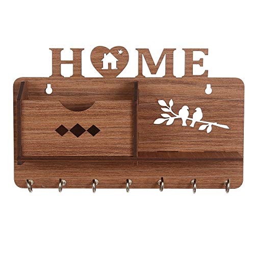 RHT - حامل مفاتيح من خشب ليفي متوسط الكثافة يثبت على الحائط لديكور المنزل والمكتب وغرفة المعيشة مع حامل موبايل (المنزل)، بني