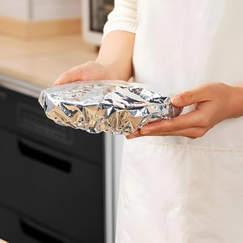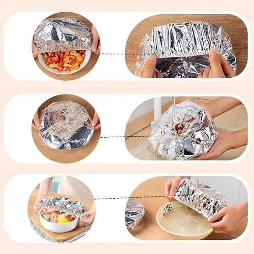 - يتم توفير أغطية رقائق الألومنيوم المعزولة كمجموعة من 10 وحدات مصممة للحفاظ على الطعام مغطى وتخزينه في ختم محكم؛ فهي تعمل كأغلفة واقية لبقايا الطعام وكذلك للأواني والحاويات، مما يتيح المطبخ الأنيق والمنظم أو النقل أثناء التنقل.