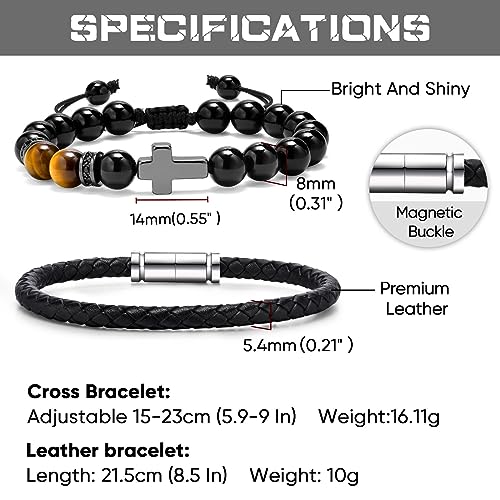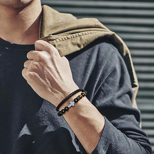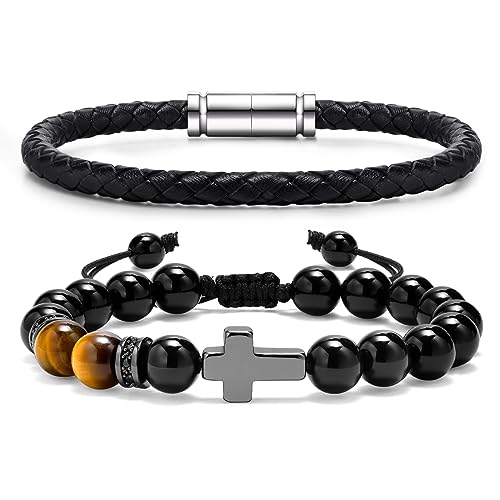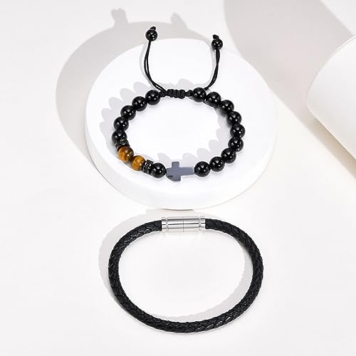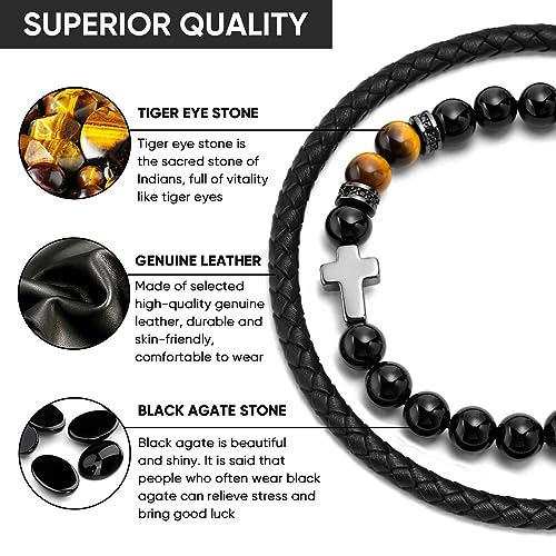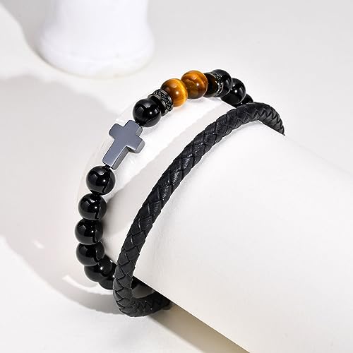 MEALGUET - ميلجويت اساور من الستانلس ستيل للرجال من قطعتين: سوار خرز من الاحجار الكريمة السوداء وعين النمر والعقيق المتقاطع وسلسلة من الستانلس ستيل، مجموعة مجوهرات للرجال والنساء، فكرة هدية للرجال