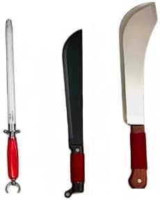 - محتويات الطقم: يتضمن 3 قطع أساسية - سكين تقطيع كبير، سكين شحذ طويل، ومبراة لشحذ السكاكين للحفاظ على حدتها