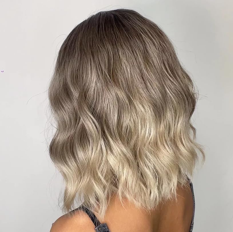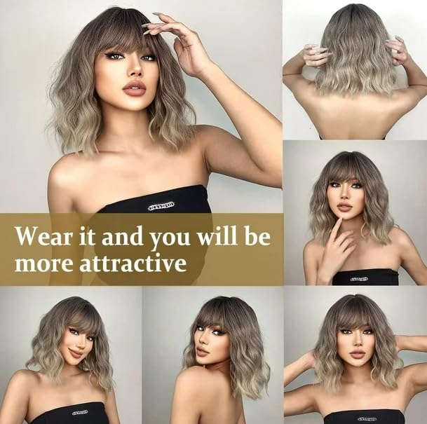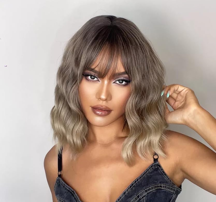 Generic - شعر مستعار مموج بقصة بوب متوسط الطول بطول الكتف ومجعد مع غرة ستارة، باروكة طبيعية لطيفة 40 سم إلى 45 سم، جذور سوداء إلى زيتوني رمادي -موديل CM-JW52-52-109/6
