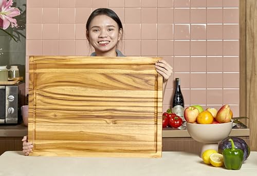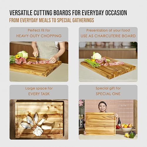 - [متانة تدوم طويلاً]: ألواح التقطيع الخاصة بنا لا تتشوه أو تنقسم أو تتشقق. مصنوعة من خشب الساج عالي الجودة المعروف بقوته ومتانته وعمر افتراضي أطول مقارنة بالبلاستيك والخيزران والجوز وألواح التقديم التقليدية الأخرى، تسمح لك ألواح التقطيع للمطبخ الخاصة بنا بإكمال كل خطوة من التحضير والتقطيع إلى التقديم، كل ذلك باستخدام لوح تقطيع واحد.