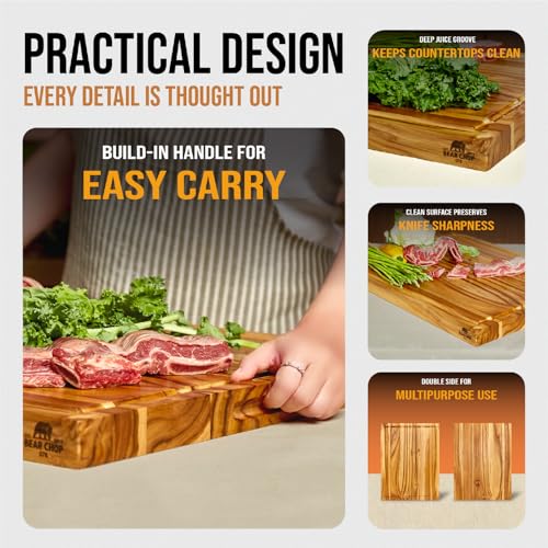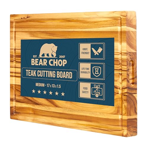 EST 2007 BEAR CHOP - لوح تقطيع من خشب الساج المحبب متوسط الحجم للمطبخ، لوح تقطيع خشبي بسمك 17 × 13 انش مع اخدود عصير ومقابض (خشب الساج - حافة الحبوب، 3. متوسط - 17 انش × 13 انش × 1.5 انش)