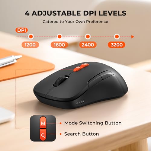 - 【وظيفة ماوس محسنة】يتميز الماوس الجديد باختصار بحث مخصص على سطحه العلوي. بضغطة واحدة، فإنه ينشط على الفور وظائف البحث المدمجة لكل من ويندوز وماك، مما يتيح لك بدء البحث عن الملفات أو استفسارات التطبيق دون رفع يدك عن الماوس. يأتي هذا الماوس أيضًا مزودًا بحساسية DPI من 4 مستويات (1200/1600/2400/3200) للتحكم الدقيق في المؤشر، ومفتاح تبديل الوضع المباشر للتبديل بين 2.4 جيجا واتصالات البلوتوث المزدوجة.