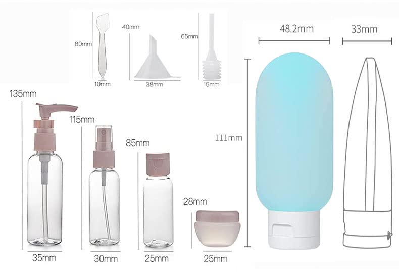- مجموعة زجاجات السفر القابلة لإعادة الاستخدام: 1 زجاجة مضخة 80 مل، 1 زجاجة رذاذ 50 مل، 1 زجاجة قابلة للطي 30 مل، 1 قمع، 1 ملعقة سباتولا، 1 ماصة، 2 خزان حليب 10 غرام و3 زجاجات جل السيليكا 60 مل.