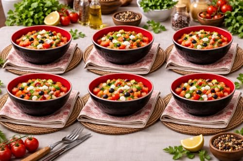 - طقم أوعية متعدد الاستخدامات: يتضمن 7 أوعية بتصميم أنيق باللون الأحمر من الداخل والأسود من الخارج، مثالية لتقديم السلطات والحساء والوجبات المتنوعة