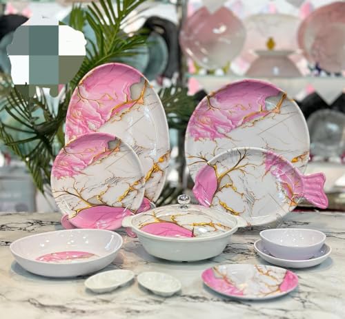 - طقم أطباق فاخر: يتضمن 38 قطعة من الميلامين عالي الجودة بتصميم رخامي وردي وذهبي أنيق يضيف لمسة عصرية وفخامة لطاولتك