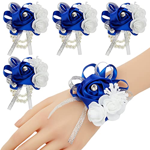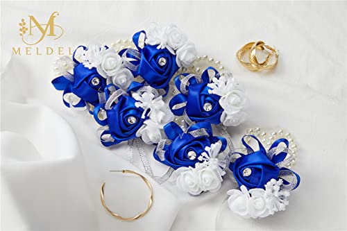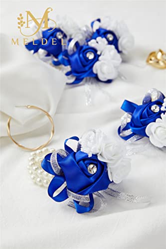 Meldel - ميلدل كورساج معصم بلون ازرق ملكي لحفلات التخرج مجموعة من 4 قطع كورسات المعصم الوردية للعروس ووصيفات العروس للبنات والزفاف والامهات والنساء زهرة يد الزفاف والعشاء الرسمي وحفلات العودة للوطن