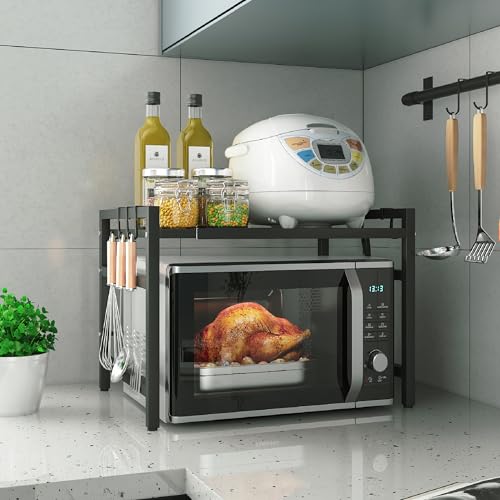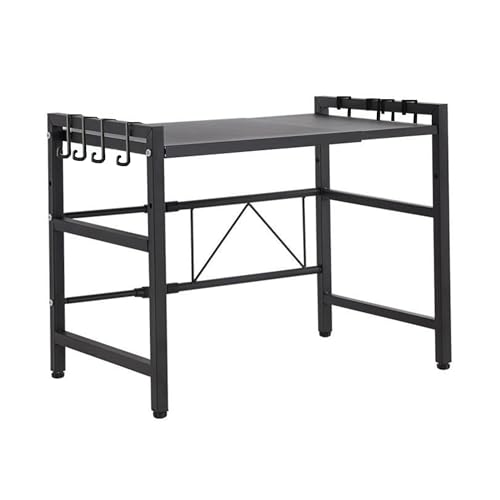 Mellingcasa - حامل فرن ميكروويف، حامل ميكروويف قابل للتوسيع من طبقتين لتخزين أدوات المطبخ وأدوات المائدة، رف من الصلب الكربوني للتعليق فوق سطح المكتب مع 6 خطافات من ميلينجكاسا (أبيض)