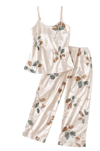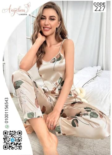 Generic - memo طقم بيجامة نسائي ساتان بنقشة زهور، توب بحمالات وبنطلون مريح، قماش ناعم لامع، تصميم أنيق للنوم والبيت والاستخدام اليومي تلبيس من 85 الي 90 كجم