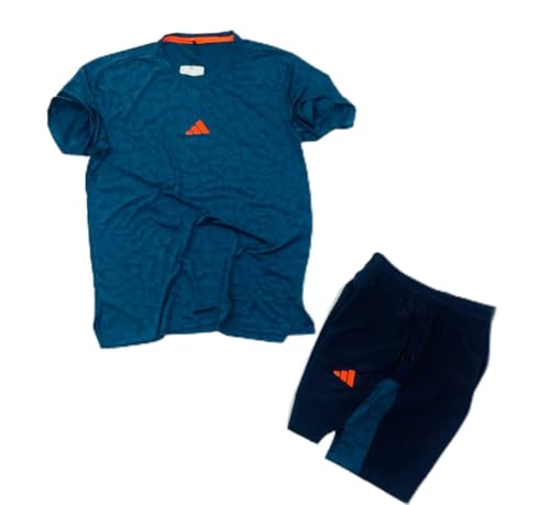 Generic - طقم رياضي للرجال، قطعتين، تي شيرت وشورت، أزرق داكن مع تفاصيل برتقالية