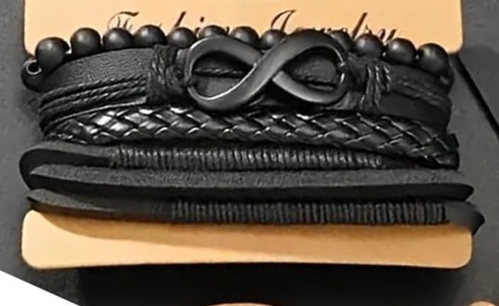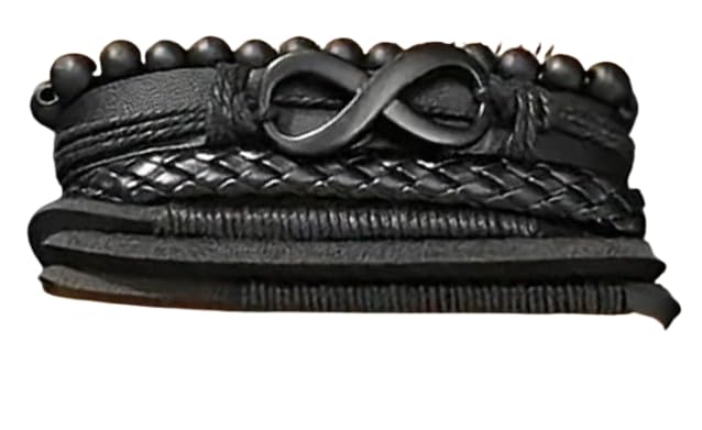 Generic - طقم اساور للرجال من الجلد الاسود والخرز مع حلية انفينيتي - اكسسوار عصري بطبقات