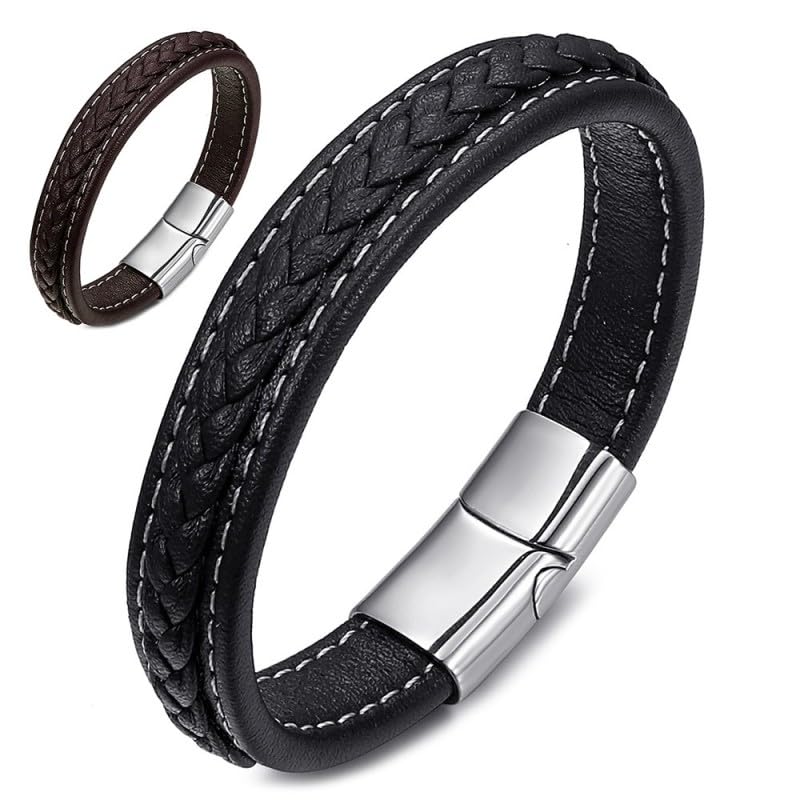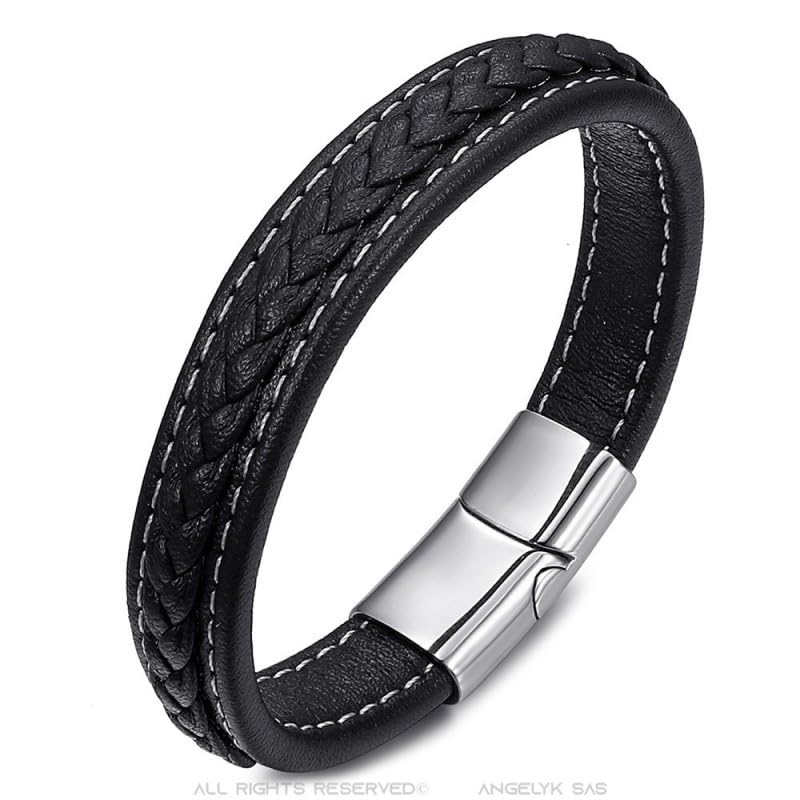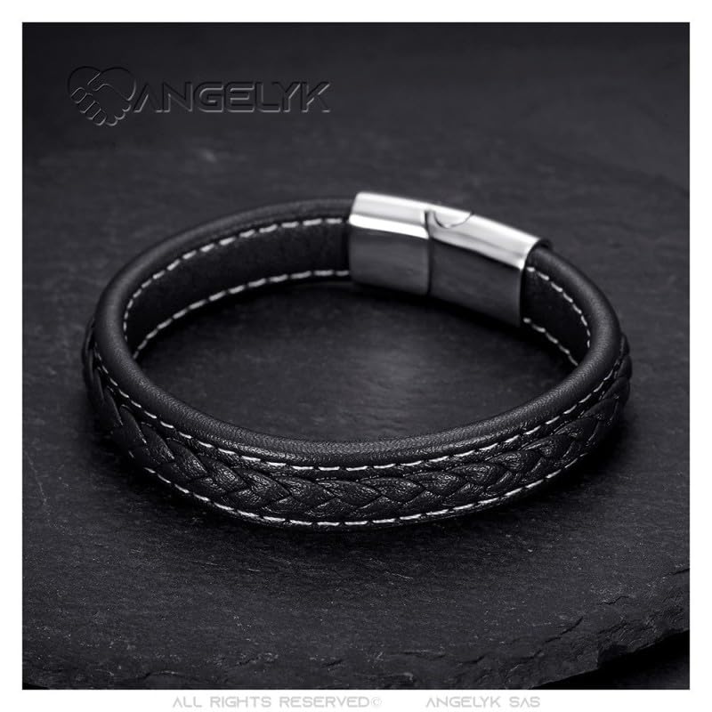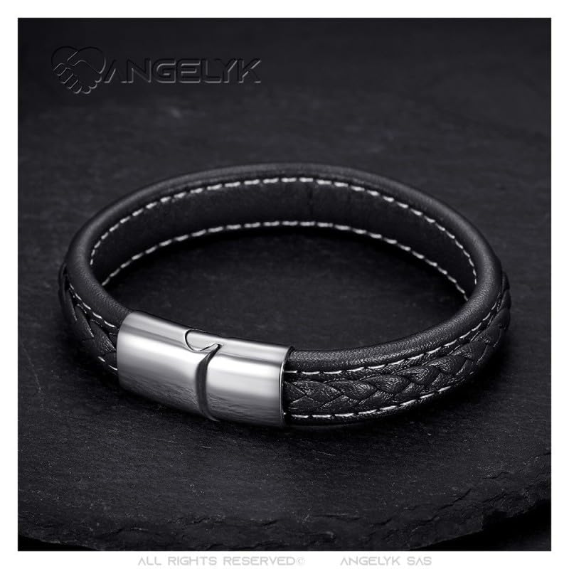 generic - سوار للرجال مصنوع من الجلد المضفر والصلب سوار جلد انكسويابل متوفر باللون الأسود أو البني بطول 19.5 سم