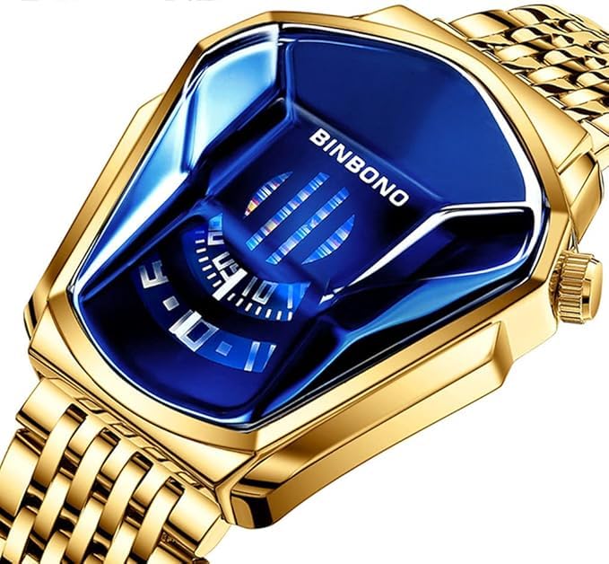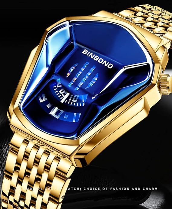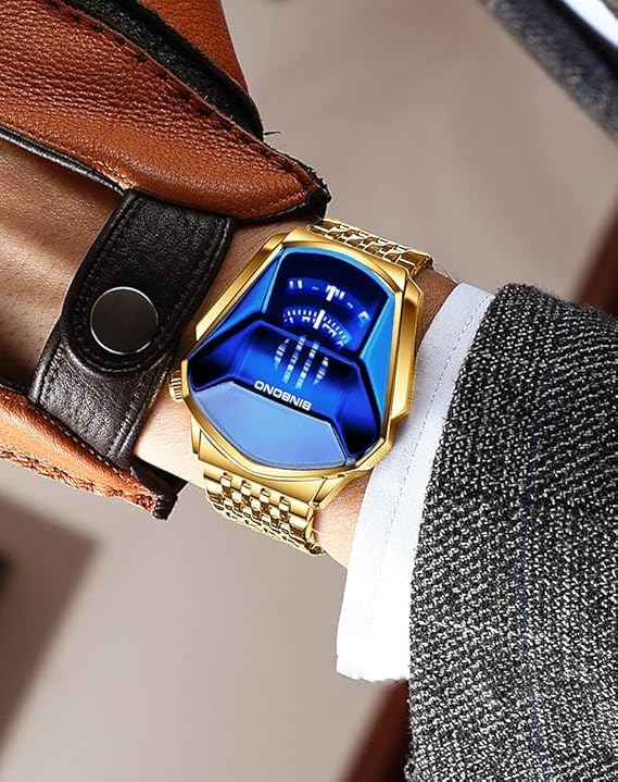 Generic - ساعة يد كوارتز كاجوال من الستانلس ستيل بتصميم هندسي للرجال، ازرق ذهبي