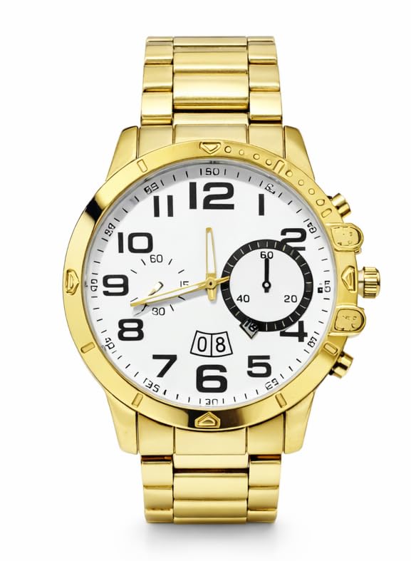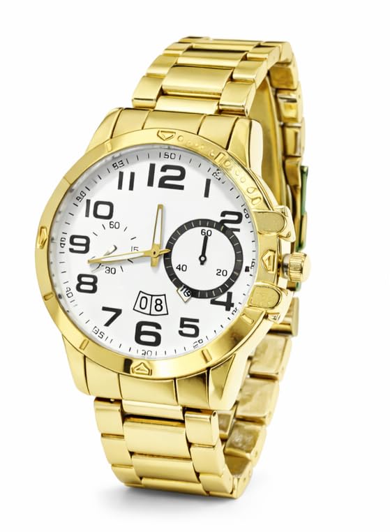 Generic - ساعة يد رجالية كرونوغراف ذهبية، سوار معدني، ميناء أبيض بأرقام كبيرة، عرض تاريخ