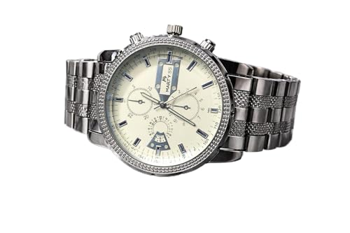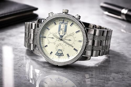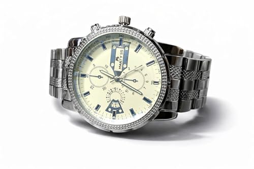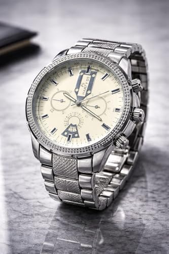 Generic - ساعة يد رجالية كرونوغراف معدنية، سوار ستانلس ستيل، ميناء كريمي، تصميم كلاسيكي رياضي