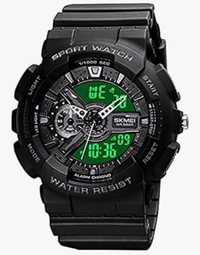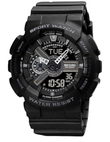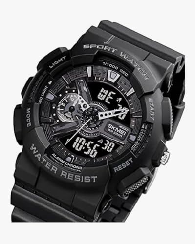 Generic - ساعة رياضية رقمية للرجال، ساعة يد كوارتز انالوج دائرية كبيرة باضاءة LED مع مناطق زمنية متعددة مقاومة للماء - 1834، اسود، مقاس L، ساعة رياضية