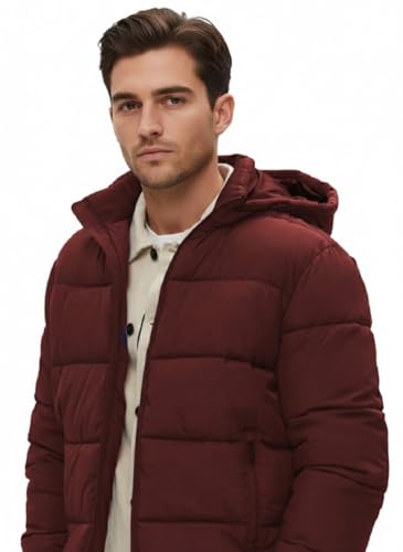 Generic - جاكيت مبطن للرجال بغطاء للرأس، لون بورجندي، معطف شتوي دافئ