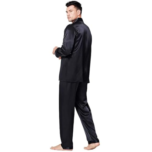 Generic - بيجامة رجالي ستان، أسود، طقم نوم من قطعتين بأكمام طويلة