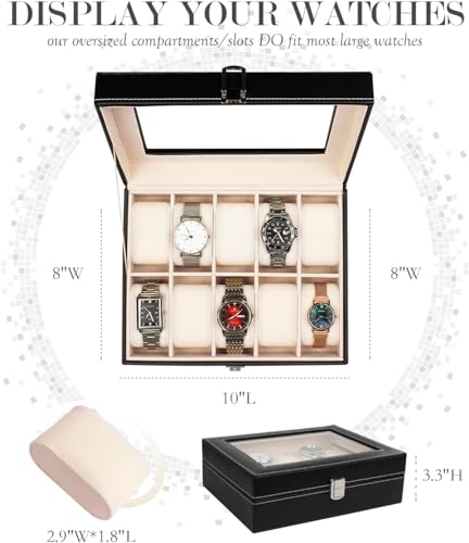 - تصميم كلاسيكي: منظم الساعات الأنيق والجميل هذا مصنوع من جلد البولي يوريثين الفاخر مع خياطة متباينة أنيقة لمظهر كلاسيكي وجذاب. كما أنه سهل التنظيف. الجزء العلوي من زجاج العرض: يمنحك الجزء العلوي الزجاجي الشفاف رؤية مفتوحة ويمكنك العثور على ساعتك المفضلة بسرعة. مثالي للاستخدام في المنزل والعمل، كما أنه أفضل هدية لعائلتك وأصدقائك وزملائك وغيرهم من الأشخاص في حياتك.