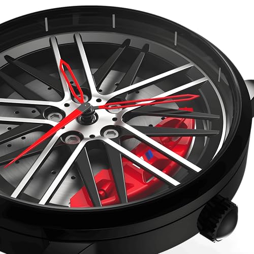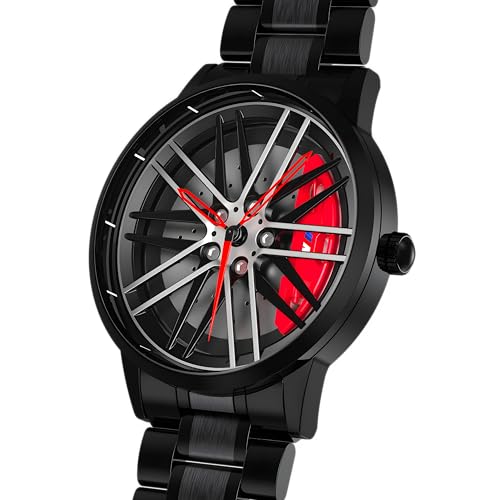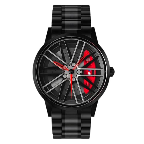 Generic - ساعة رجالية رياضية بتصميم جنوط السيارات، ستانلس ستيل، أسود مع أحمر، كوارتز، مقاومة للماء