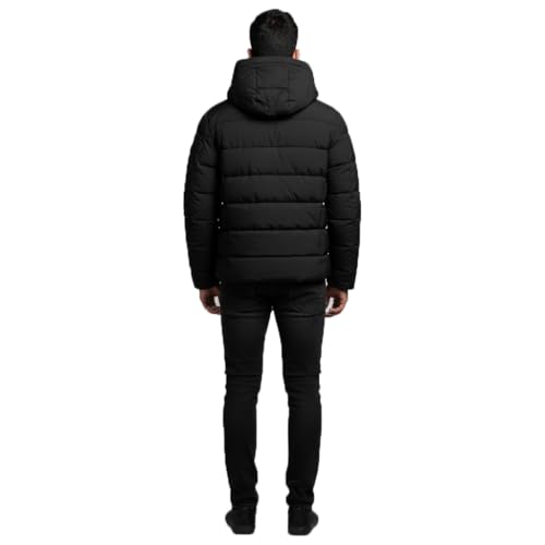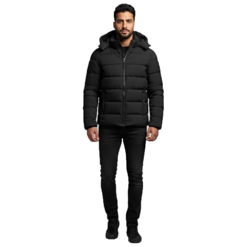 Generic - جاكيت منفوخ شتوي للرجال، معطف اسود مبطن بغطاء للرأس، ملابس خارجية مبطنة دافئة