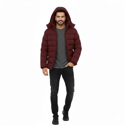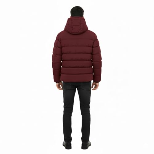 Generic - جاكيت مبطن بغطاء رأس شتوي للرجال، مبطن بالريش بلون بورجندي، ملابس خارجية كاجوال