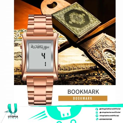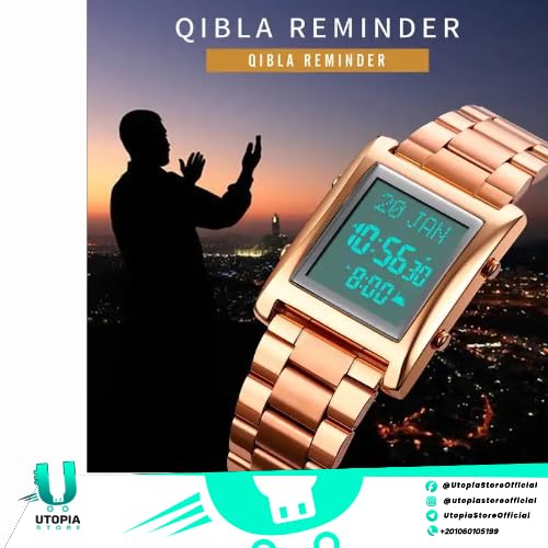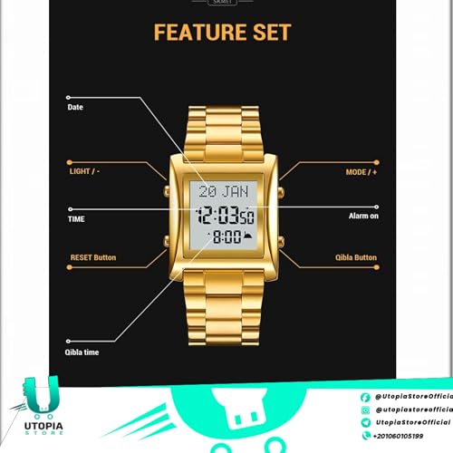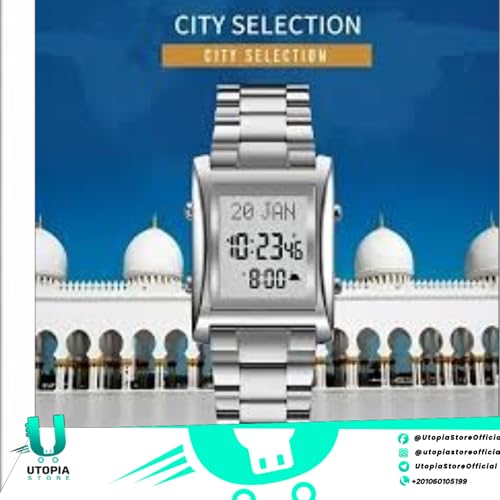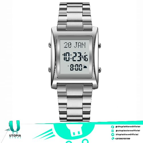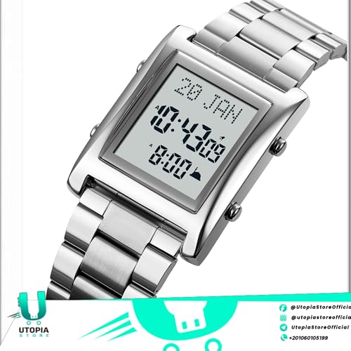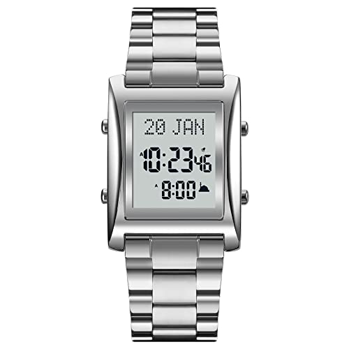 SKMEI - ساعة رقمية للرجال بشاشة LCD، تقويم هجري، مواقيت الصلاة، ستانلس ستيل، متوفرة باللون الذهبي والفضي (Silver-white)