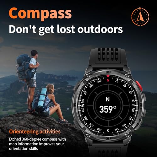 - Military Smart Watch with Built-In Compass: Never lose your way—even when off the grid. This rugged men’s smart watch features a high-precision built-in compass with dual calibration methods, delivering reliable direction anytime, anywhere. Whether you’re hiking remote trails or navigating urban streets, it helps you track your route, retrace your steps, and explore with total confidence. More than just a compass smartwatch, it’s your all-terrain companion—blending outdoor-ready navigation with smart fitness tracking and unshakeable peace of mind. Built for the mission. Designed for the modern man.