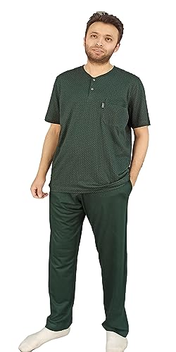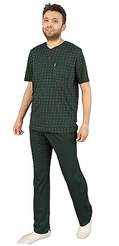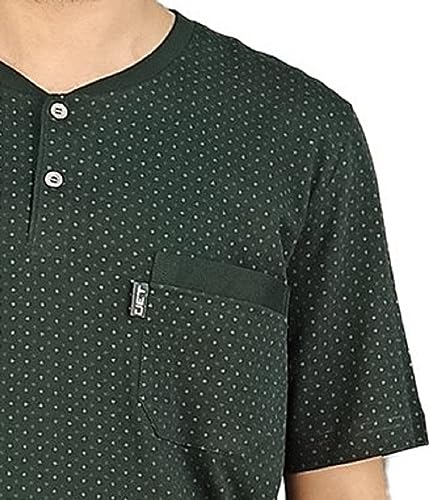 Jet (JET ) - بيجامة صيفي رجالي مطبوعة بأكمام قصيرة ورقبة روند بذرائر وبنطلون طويل - زيتي