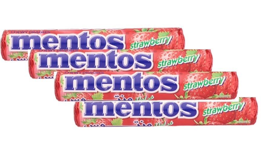 • حلويات قابلة للمضغ بنكهة الفراولة من مينتوس، 29 جم، عبوة من 4 قطع.
