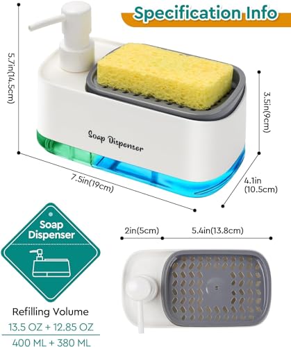 Merayo - موزع صابون لحوض المطبخ بمضخة مزدوجة وموزع غسيل الأطباق مع حامل إسفنجة من ميرايو، لون أبيض