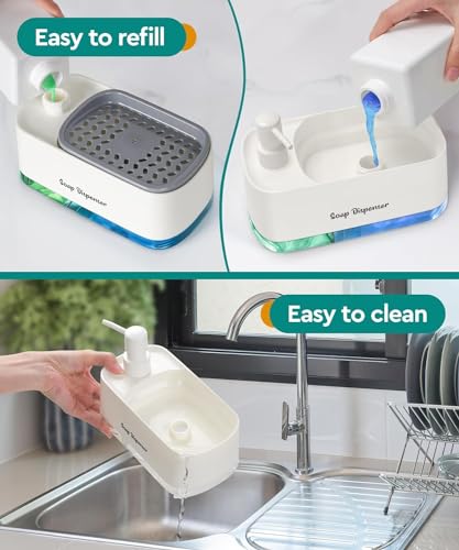 - تصميم متعدد الوظائف 3 في 1: يسمح التصميم البسيط والعصري لموزع الصابون السائل بتخزين صابون اليد بشكل مريح في زجاجة غسل اليد للمنزل وسائل غسيل الأطباق في موزع غسيل الأطباق في مكان واحد، مع توفير حامل إسفنجي لوضع الإسفنج بسهولة. لن تحتاج بعد الآن إلى البحث عن لوازم التنظيف في جميع أنحاء المطبخ. هذا التصميم المريح يجعل تنظيف مطبخك أكثر كفاءة ومتعة.