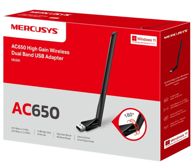 MERCUSYS - ميركوسيس محول واي فاي يو اس بي عالي الكسب MU6H AC650 من تي بي لينك، عصا واي فاي، ثنائي النطاق، 200Mbps الى 2.4GHz مع تقنية 256-QAM، 433Mbps على 5GHz، متوافق مع ويندوز 11/10/8.1/8/7/XP