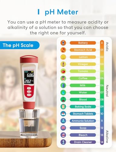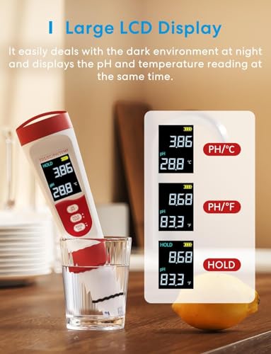 - [جهاز 2 في 1]: يقيس بدقة مستويات الحموضة (pH 0.00-14.00) ودرجة حرارة السوائل بسرعة فائقة.