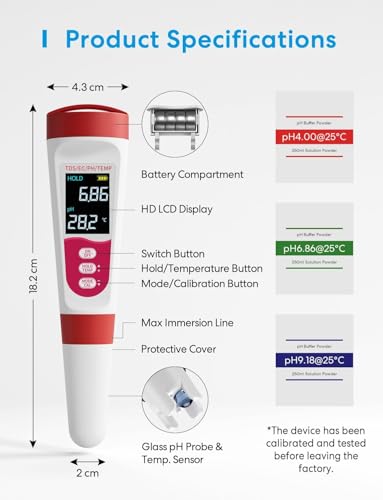 - [طقم معايرة كامل]: يتضمن المنتج 3 أكياس مسحوق معايرة (4.00, 6.86, 9.18) لضبط دقة الجهاز بسهولة وضمان نتائج موثوقة دائماً.