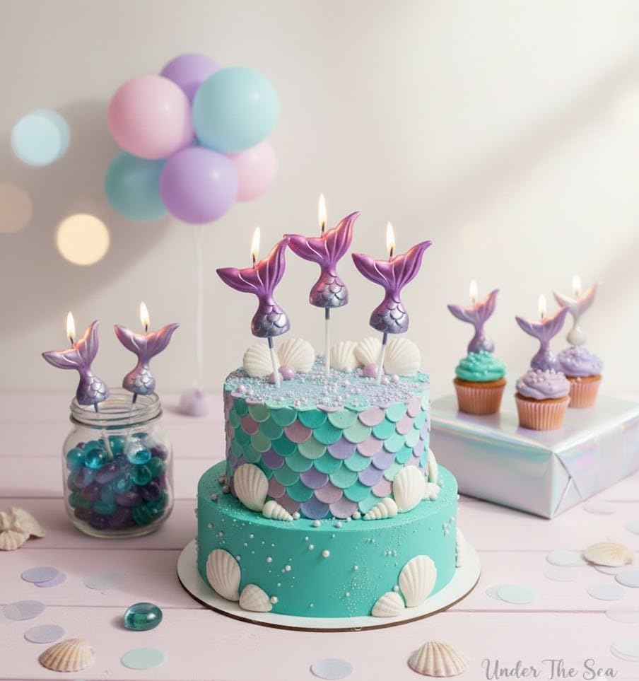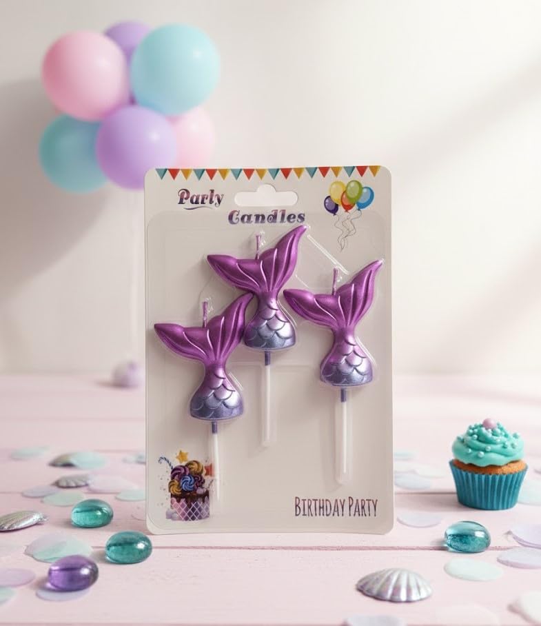 - التصميم: شموع عيد ميلاد جميلة على شكل ذيل حورية البحر الأرجواني الميتالك مع لمسة نهائية لامعة، مثالية للحفلات بطابع تحت الماء أو بطابع حورية البحر.