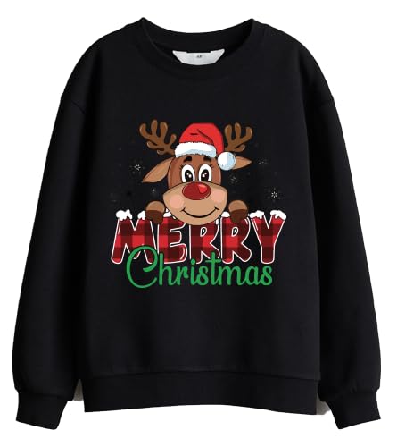Generic - سويت شيرت مطبوع عليه Merry Christmas Reindeer، مزيج من القطن الأسود، بلوفر بطابع العطلات، ملابس شتوية كاجوال مقاس (M)