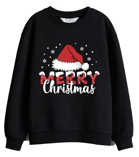 Generic - سويت شيرت بعبارة Merry Christmas، بلوفر من مزيج القطن الاسود مع تصميم قبعة سانتا، مقاس (M)