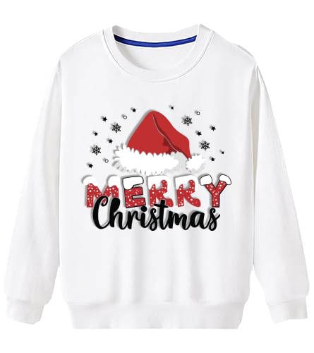 Generic - سويت شيرت بعبارة Merry Christmas، مزيج من القطن الابيض، تصميم عطلة احتفالية مع قبعة سانتا وندفات الثلج، مقاس موضوع الشتاء (9-12 سنة)