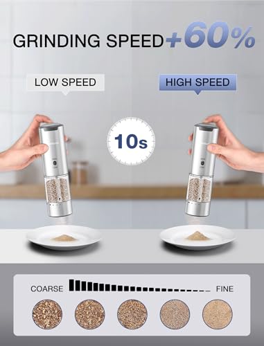 MERTTURM - مجموعة مطحنة ملح وفلفل كهربائية قابلة لإعادة الشحن من الفولاذ المقاوم للصدأ بسرعة طحن متغيرة بخشونة قابلة للتعديل وقاعدة تخزين بضوء ليد من ميرتورم، لون فضي