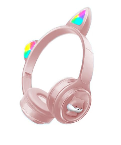 MERV - سماعات أذن لاسلكية بلوتوث بتصميم أذن قطة لطيفة مع شكل ثعلب ثلاثي الأبعاد وإضاءة ليد بألوان ار جي بي، سماعة رأس ستيريو للأطفال من الجنسين من ميرف، وردي، M31