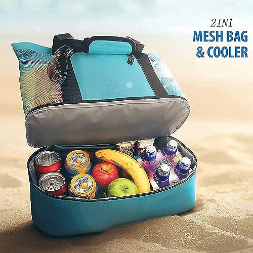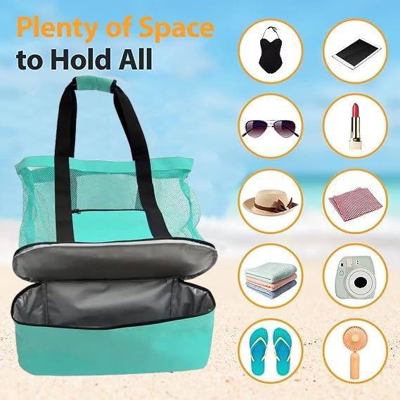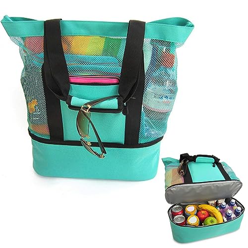 QOOWFEANIG - شنطة شاطئ شبكية مع شنطة تبريد، شنط يد كبيرة توت مع شنطة تبريد معزولة للسفر، شنطة ألعاب الشاطئ مع سوستة لمستلزمات السفر والعطلات الصيفية والنزهة وحمام السباحة للنساء والأطفال