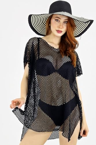 Generic - فستان تغطية شاطئ شبكي، ثوب سباحة برقبة على شكل حرف V، كم قصير، اسود