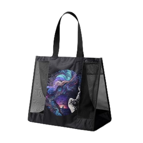 Generic - شنطة تسوق شبكية بتصميم فني المجرة، اسود مع طباعة كوزميك باللونين الارجواني والازرق