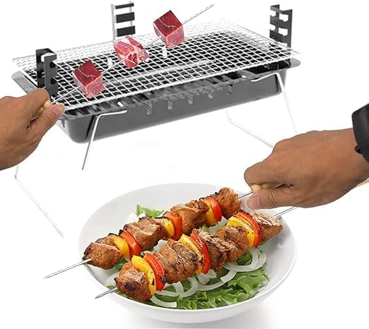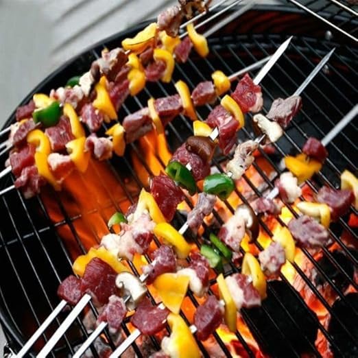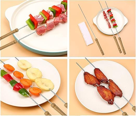 Generic - اسياخ شواء معدنية مع حامل خشبي، مجموعة من12 قطعة، اسياخ طويلة مضادة للحرق للشواء قابلة لاعادة الاستخدام، مناسبة للتخييم في الهواء الطلق والطبخ.