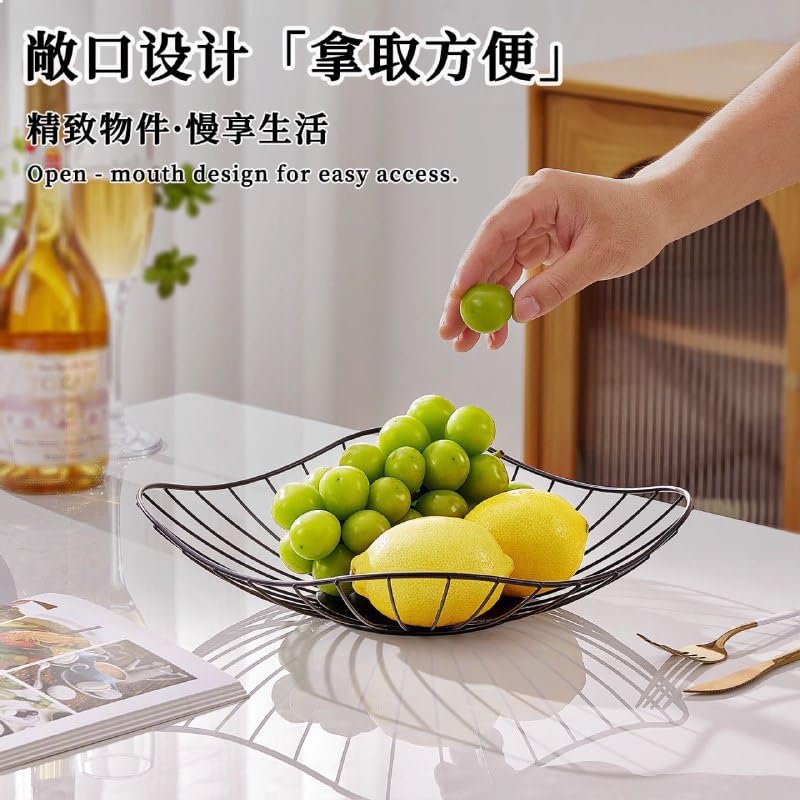 - يتميز بتصميم معدني هندسي مفتوح يضمن تدفق الهواء المستمر حول الفاكهة، مما يساعد في نضجها بشكل طبيعي ويمنع فسادها السريع مقارنة بالأطباق المغلقة.