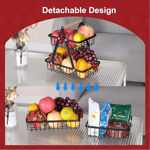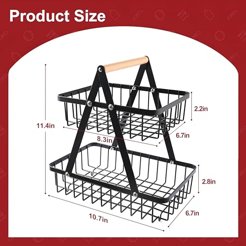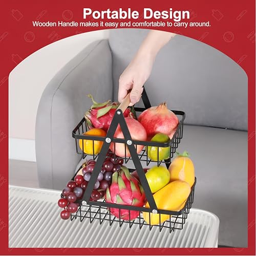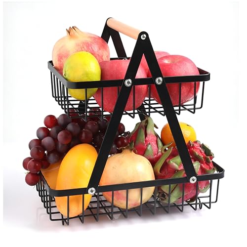 Generic - سلة تنظيم معدنية - حامل فاكهة اسود مزدوج الطبقات مع مقبض خشبي، مثالي للاستخدام على سطح الطاولة في المطبخ او غرفة الطعام، الجزء السفلي 27.2 × 17 سم، الجزء العلوي 21.1 × 17 سم